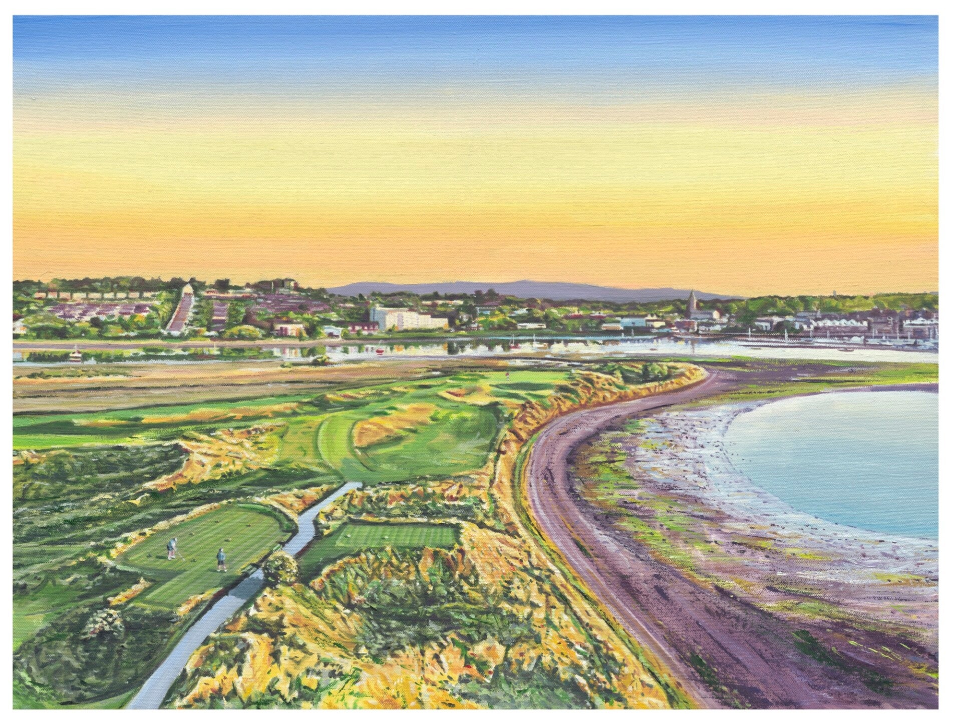 The sky shifts from soft gold to deep blue, casting warm light across the links and creating a vivid contrast between fairway, dune, and tide. In the distance, Malahide town rests across the estuary, anchoring the scene in a sense of place and history.